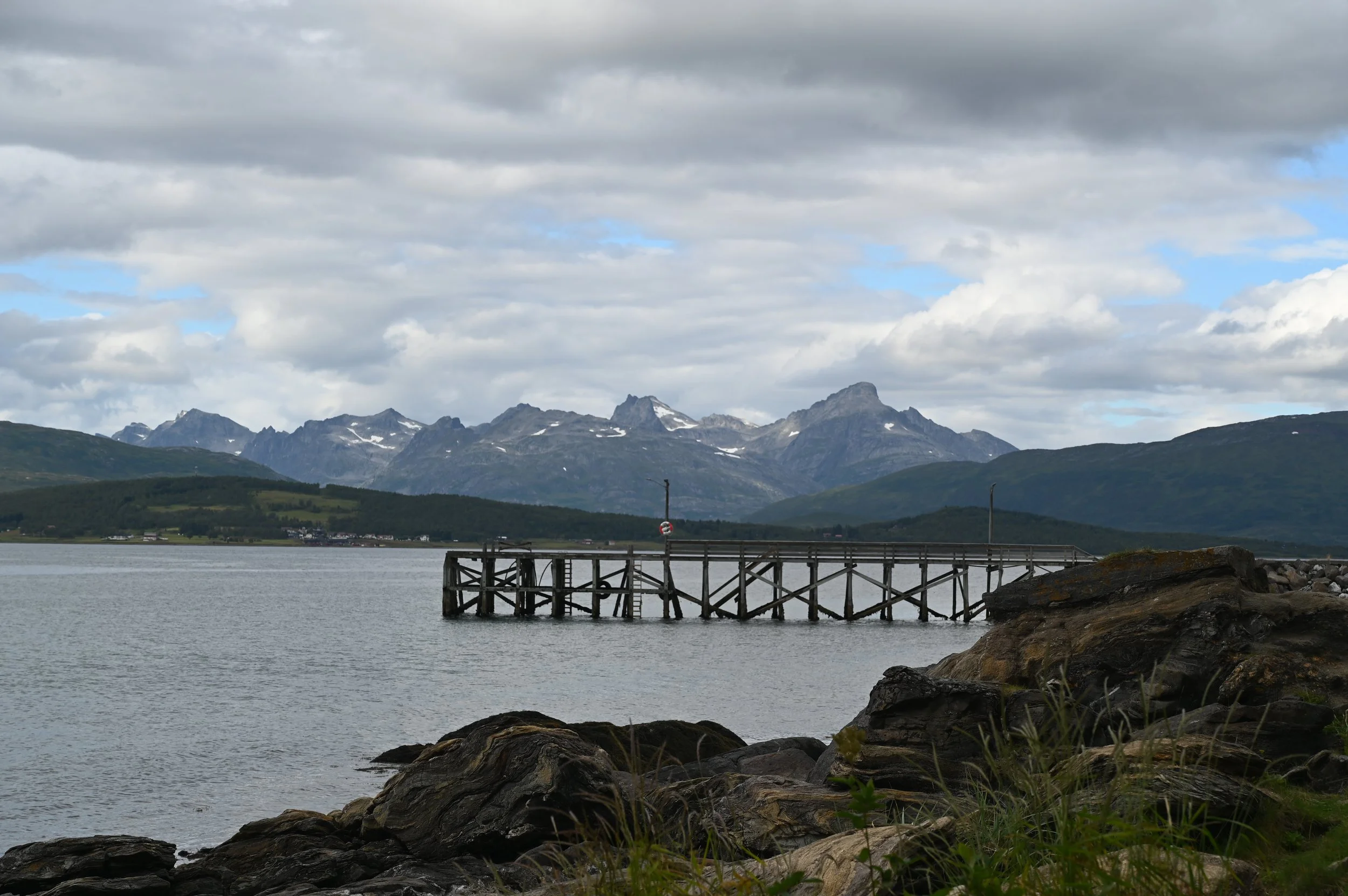 Iconic view of the pier in Telegrafbukta with the mountains of Kvaløya in the background.