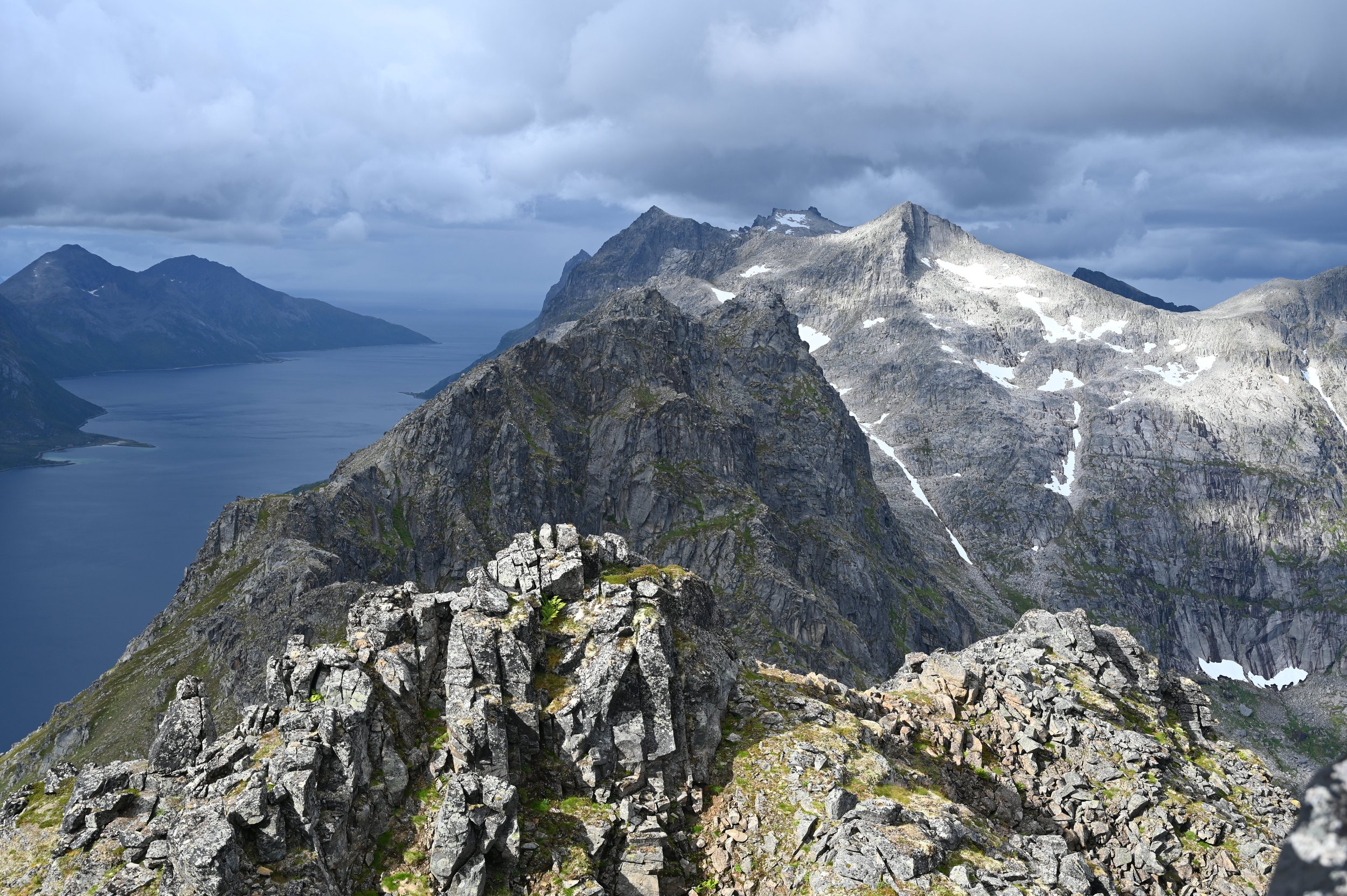 Some of the mountains located on Kvaløya. This is from “Buren” with Ersfjorden on the left side.